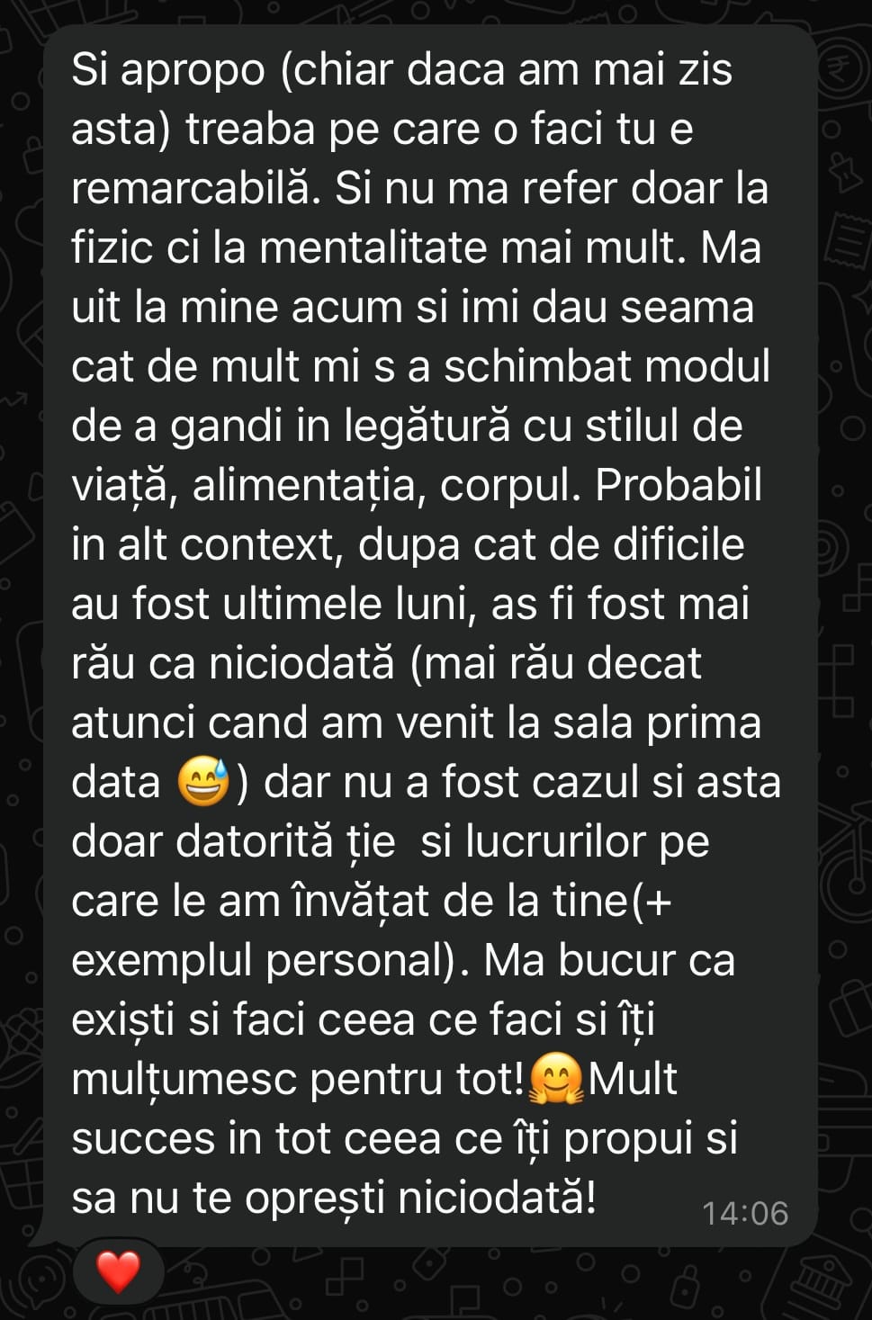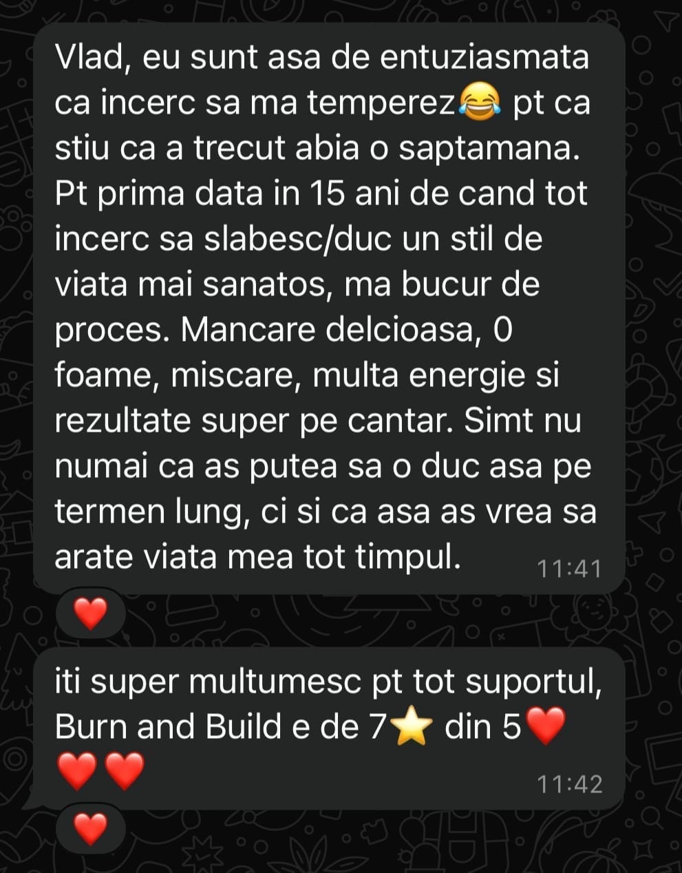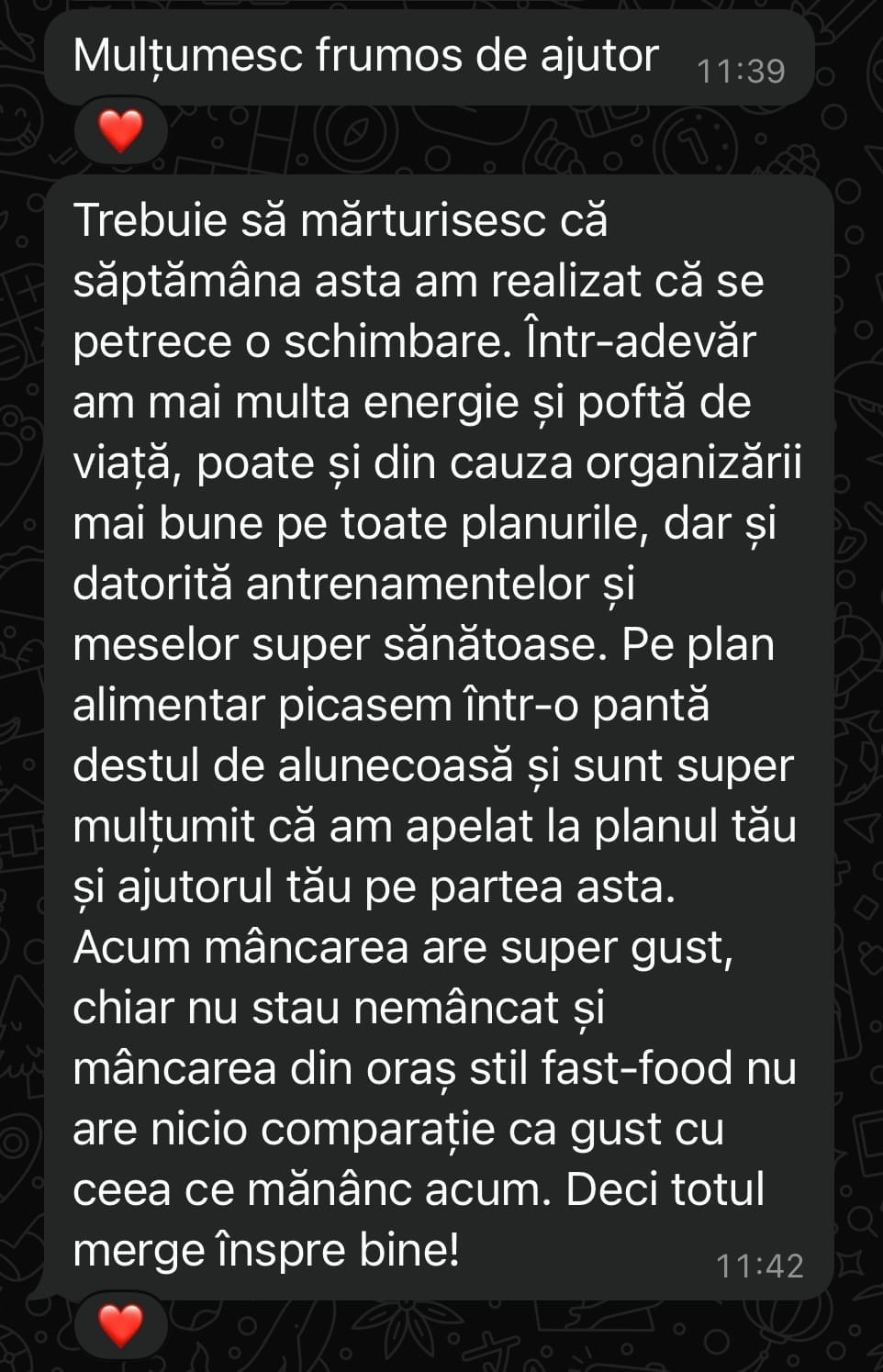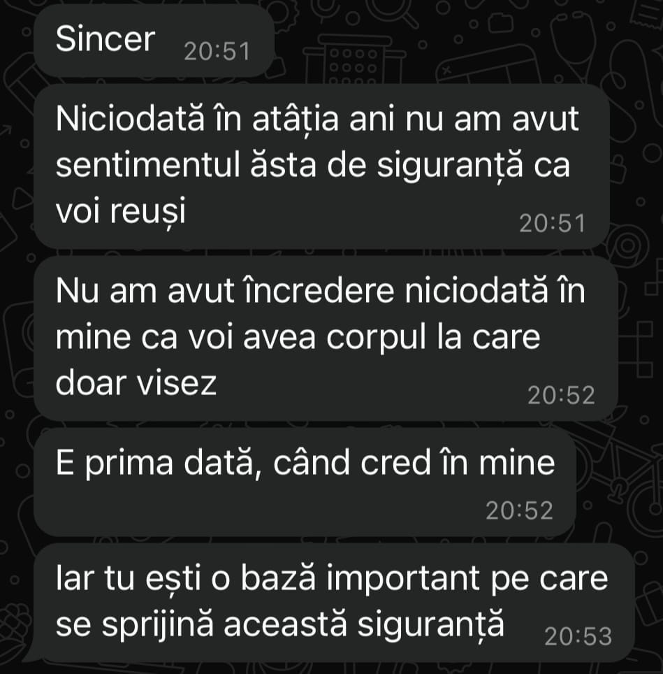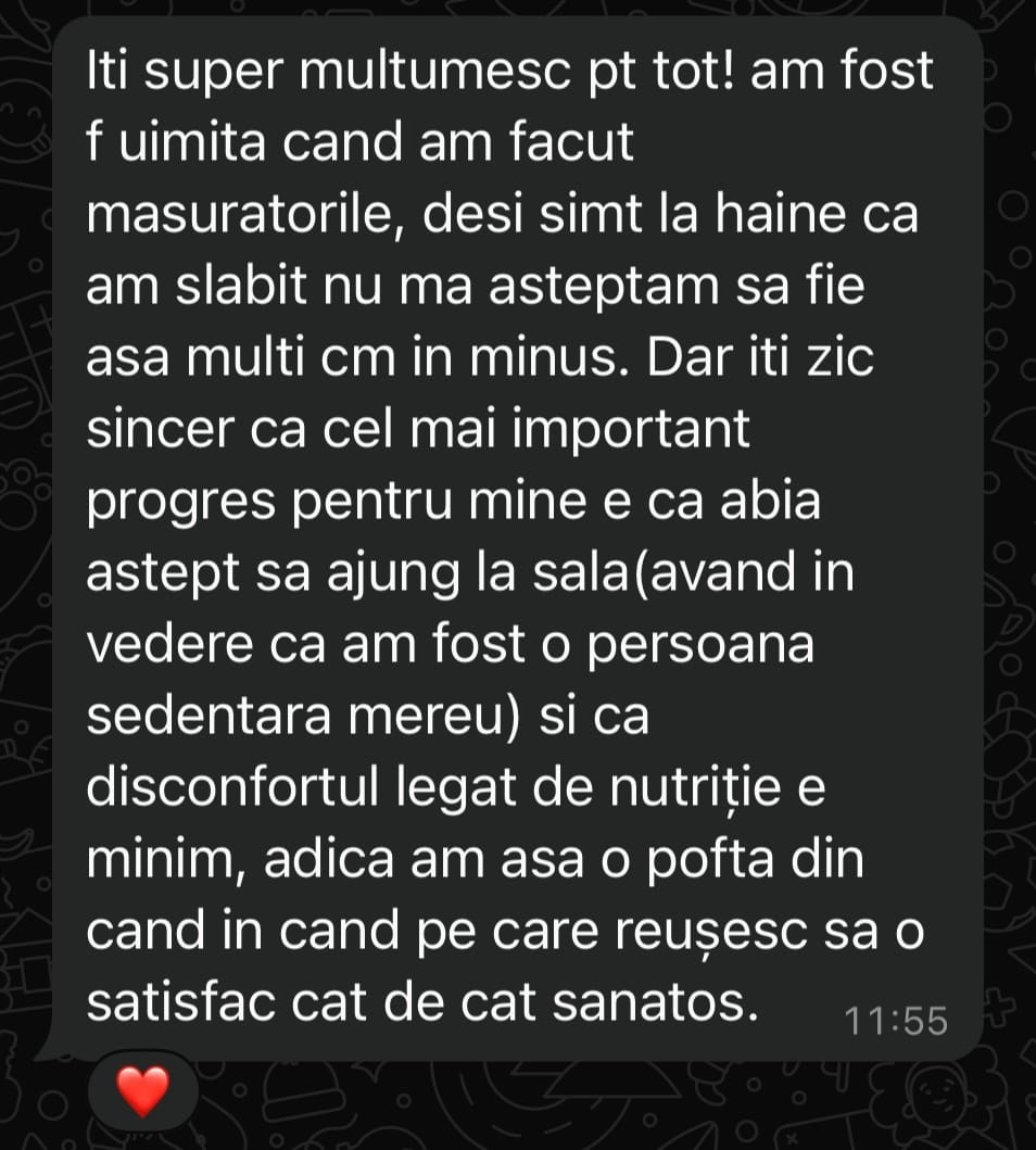Scopul meu e simplu: să mă asigur că te ții de plan. Îți verific zilnic panoul de progres, istoricul antrenamentelor și activitatea ta din aplicație. Vorbim în fiecare zi pe WhatsApp (luni–duminică), ca să nu te simți nicio secundă singură în proces.