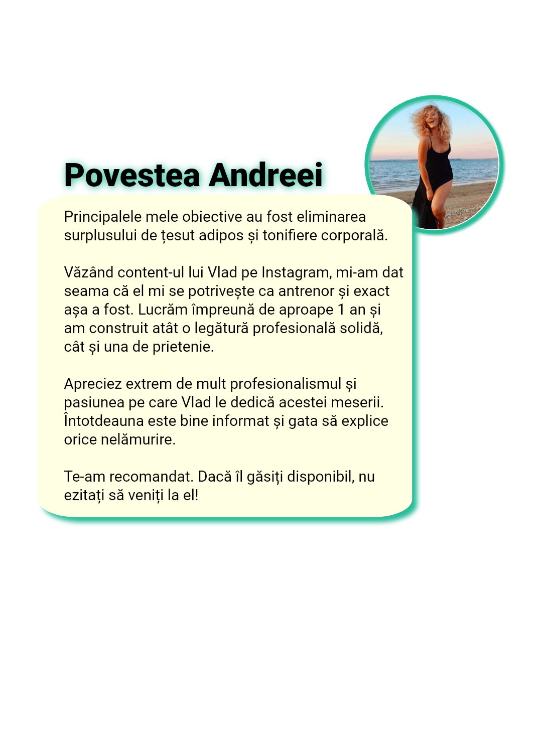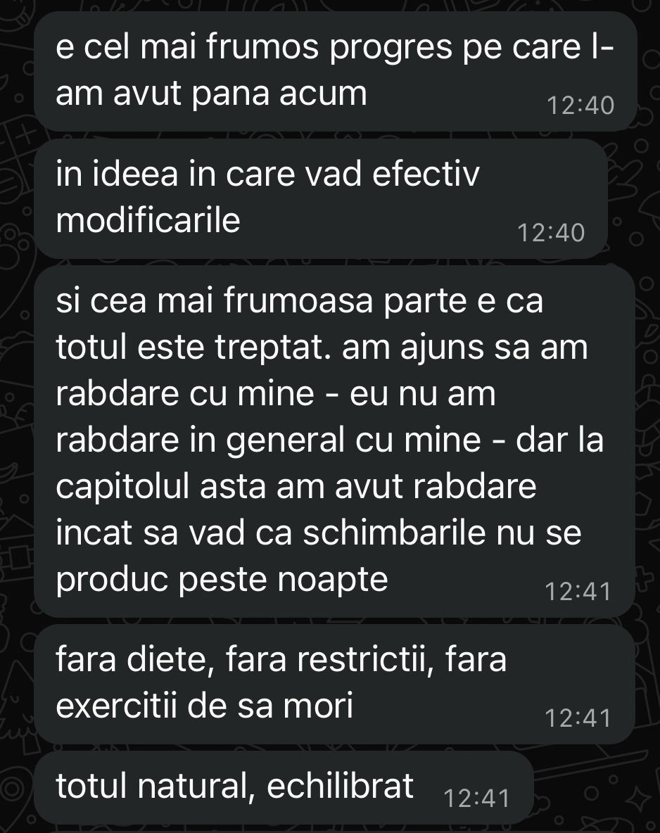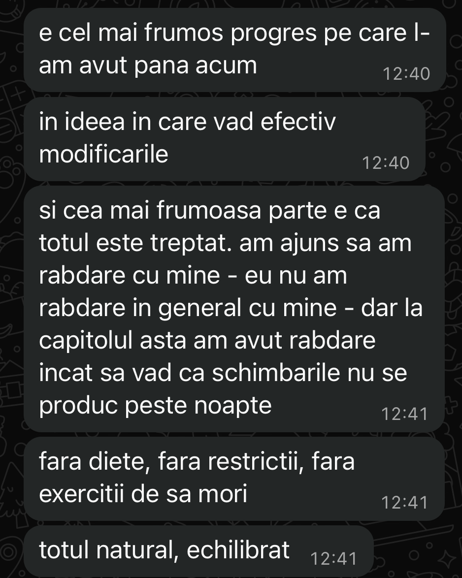 Îți spun direct: nu lucrez cu oricine. Nu pentru că sunt “pretențios”, ci pentru că implicarea mea în procesul fiecărei femei este extrem de mare și îmi asum 100% responsabilitatea pentru rezultate.