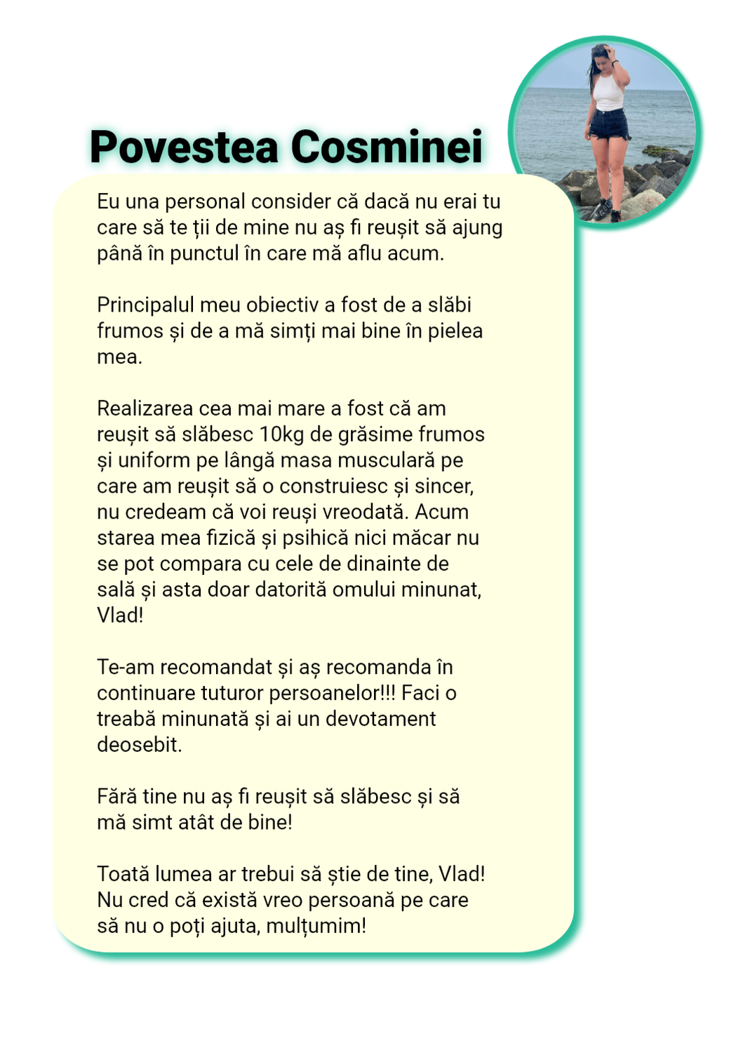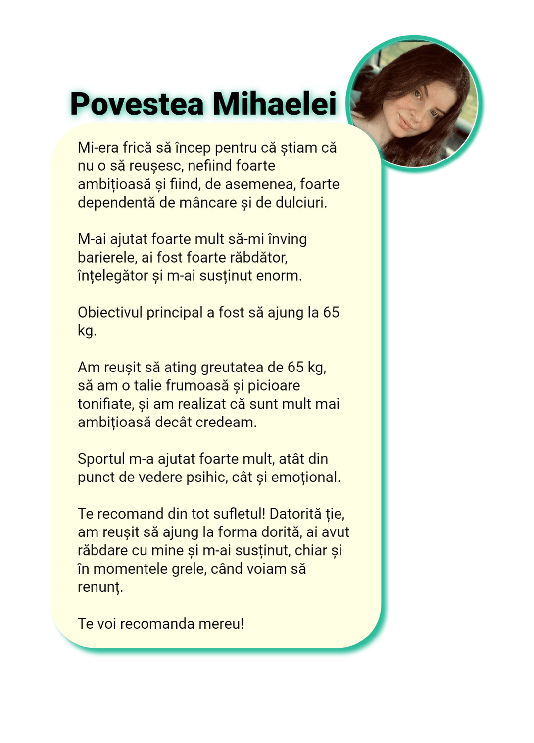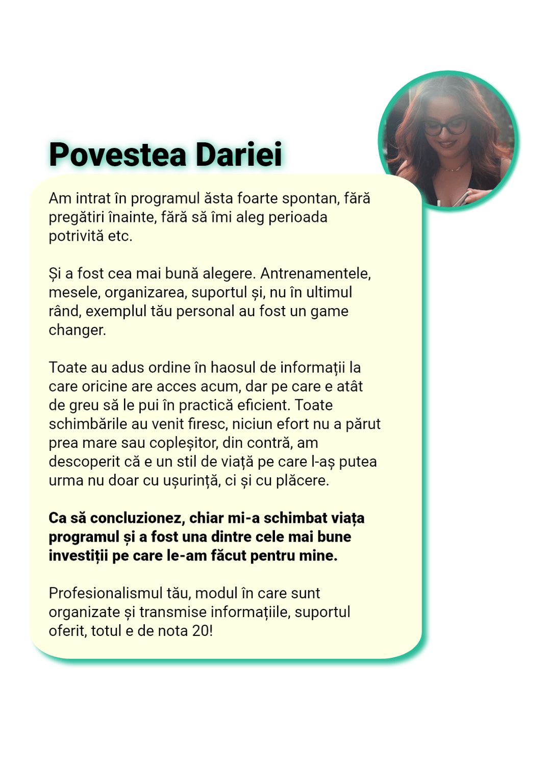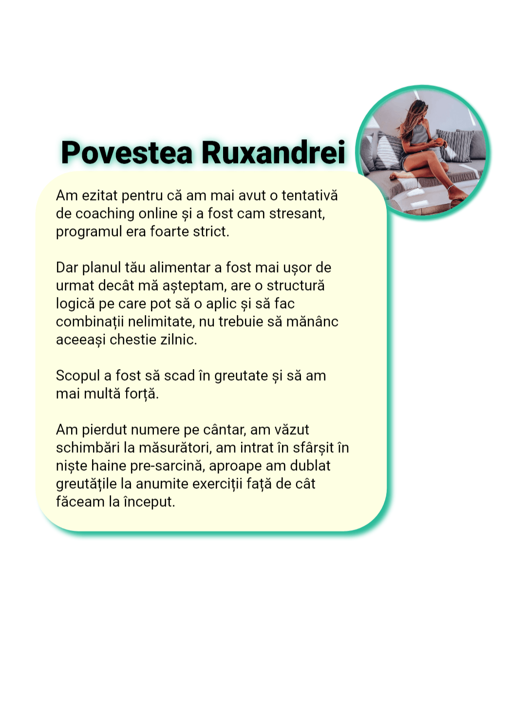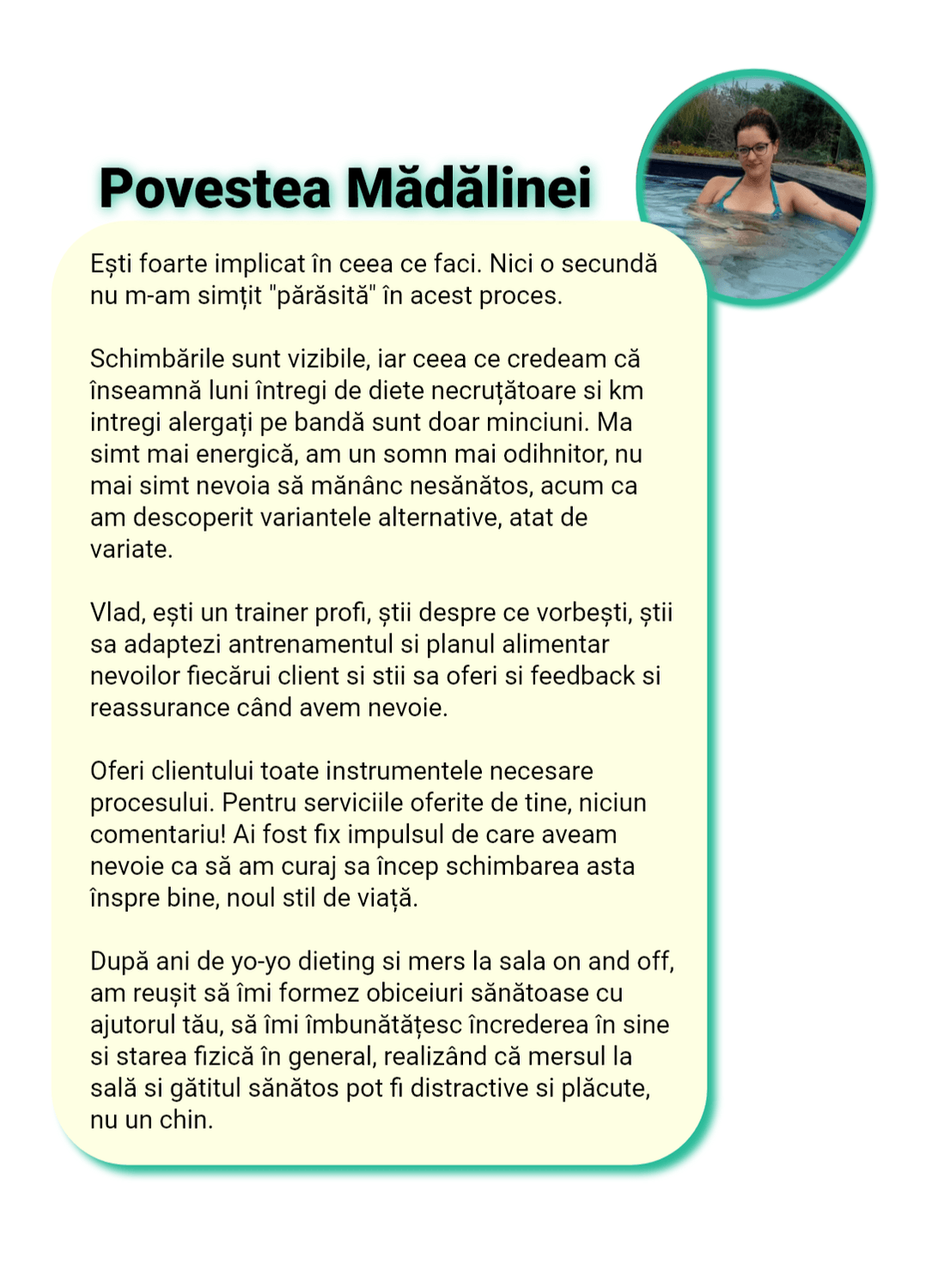 Sunt cu „ochii pe tine” în fiecare zi. Nu ca să te cert, ci ca să te sprijin, să te corectez rapid și să te țin pe direcția care te duce la rezultat, nu înapoi la efectul yo-yo.