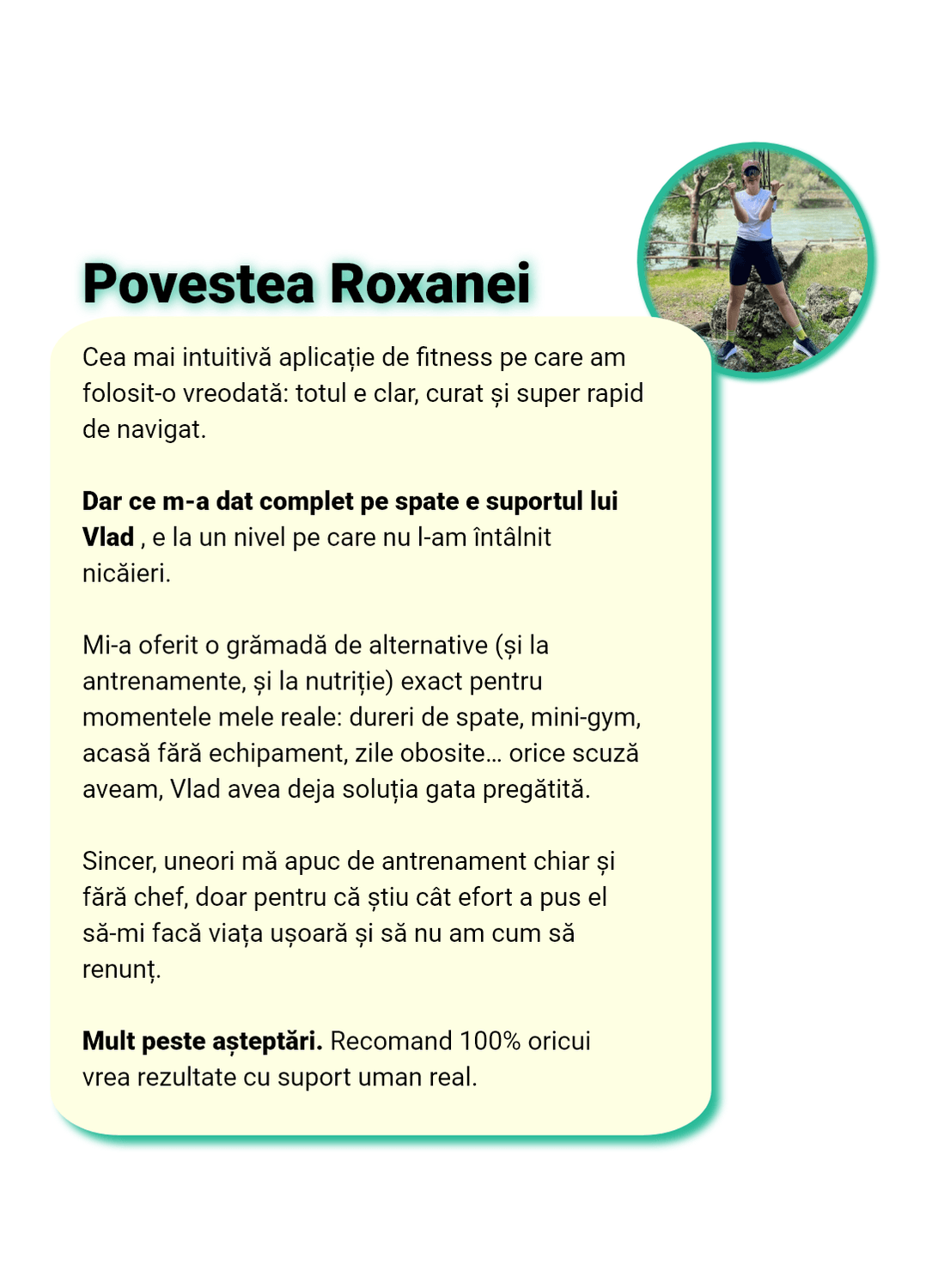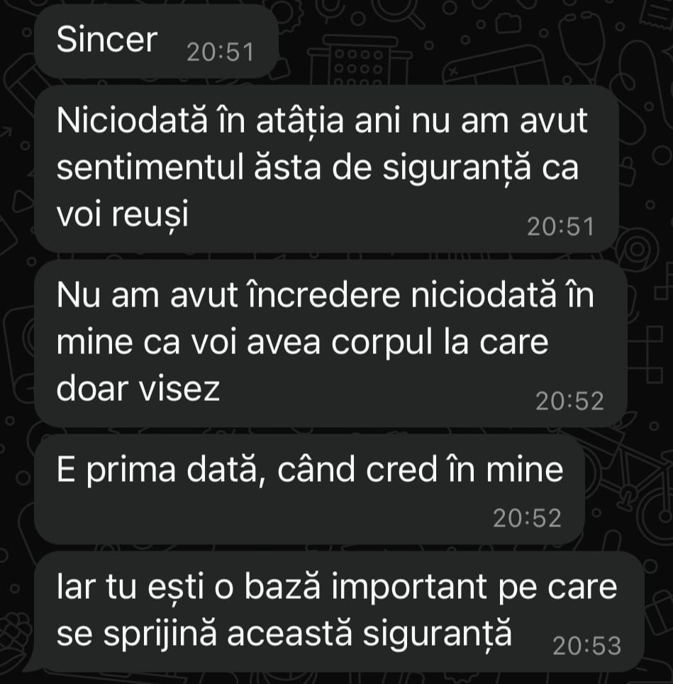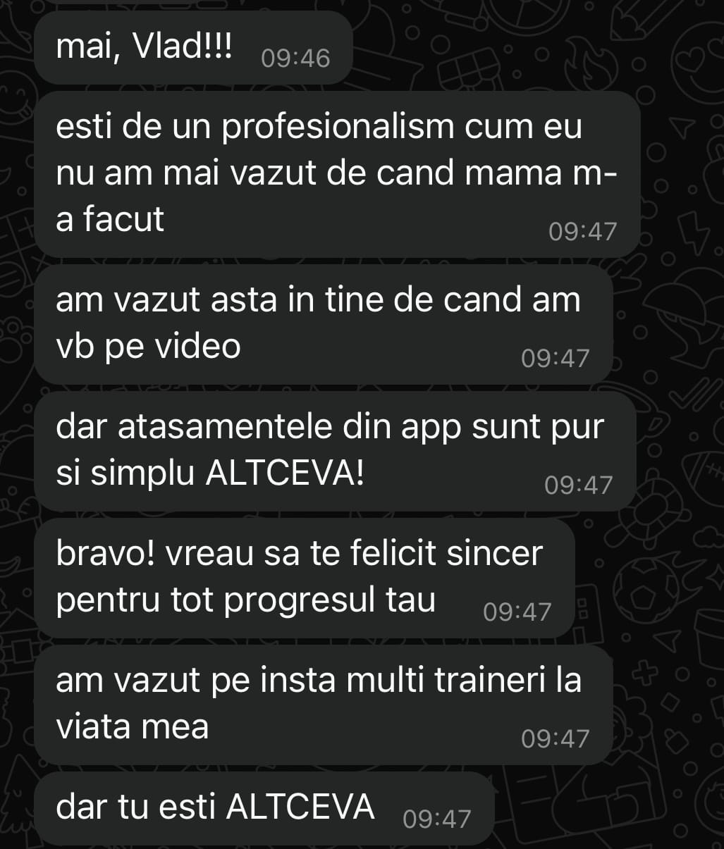 Vreau să fie clar: programul de antrenament este 100% personalizat pentru tine. Nu primești șabloane, PDF-uri sau exerciții peste nivelul tău. Dacă ceva nu se potrivește, se schimbă instant.
